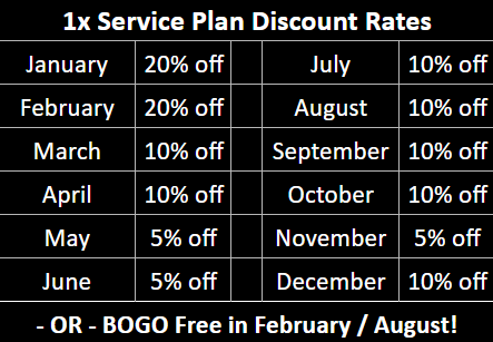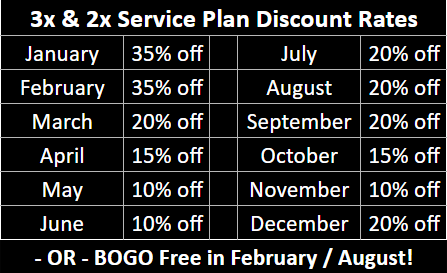 The discounts for this plan are based on the months you choose for service. Our slowest months have the best discount (up to 35% off!) and our busy months have the smallest discount (10% off). See the chart below to decide which months are best for you.
